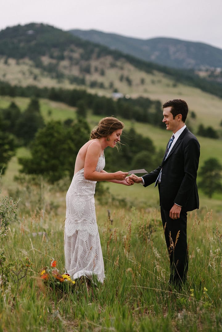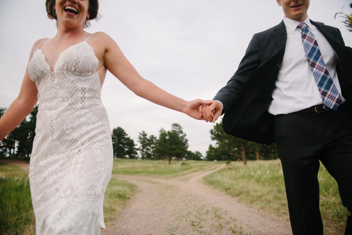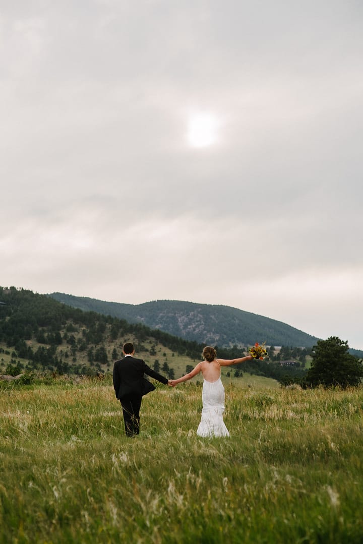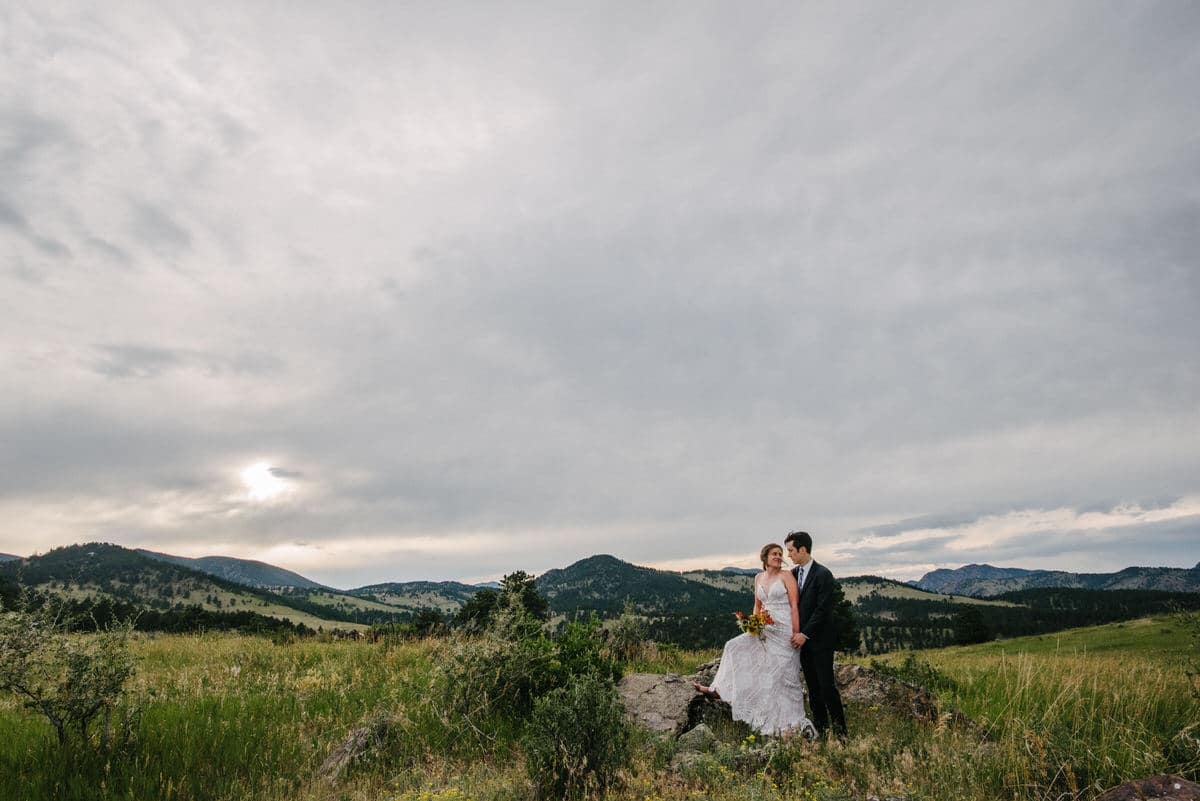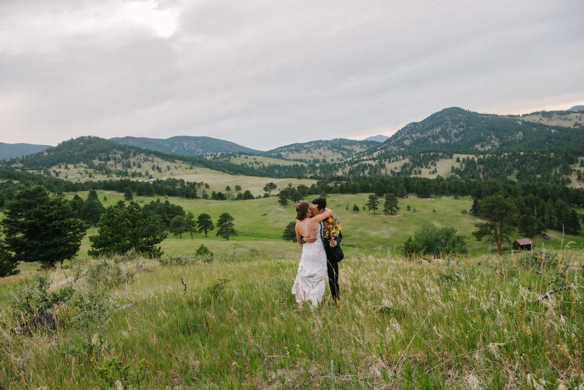 MG and Andrew were first faced with the tragedy, when Andrew’s mother died of cancer, which meant pushing up their wedding date in order to have her there, watching them give their Vows to one another by her hospital bedside. Fast forward to 2020 when they were going to celebrate with their friends and family by throwing the wedding and reception they never had, when the pandemic hit-making gathering and travel unsafe and impossible. So these two made the decision to put on their fancy wedding clothes, renew their Vows in a spot they loved in the foothills of Colorado, and finish the night off playing frisbee in the park and having a picnic with Pizza from Hop Alley. This can give inspiration to anyone who needs small wedding ideas.
